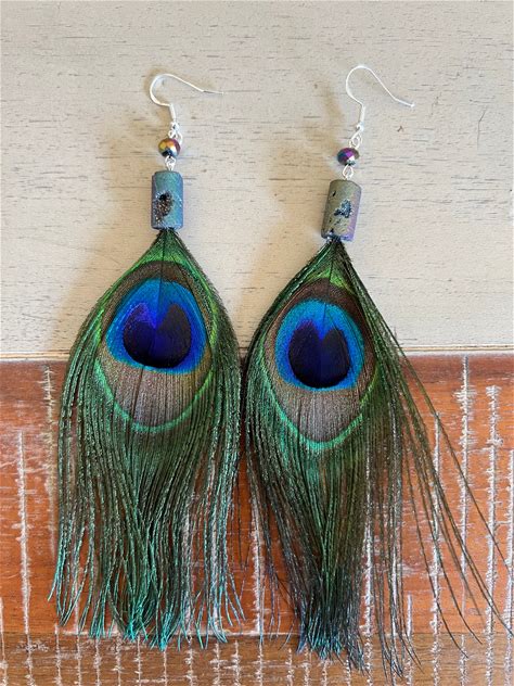 Feather Earrings Peacock Feathers Colorful Feather Earrings Boho Jewelery Feather Jewelry Beaded Feather Earrings Large Earrings Flashy