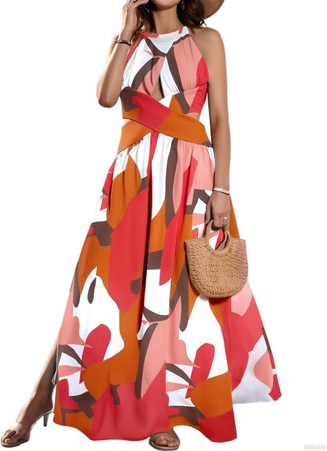 CHICME Women's Sleeveless Halter Neck Dress Criss Cross Tie Back Split High Maxi Dress