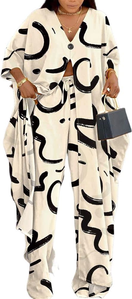 CHICME Women's 2 Piece Outfits Abstract Print Batwing Sleeve V Neck Top With High Slit And Loose Wide Leg Pants Set