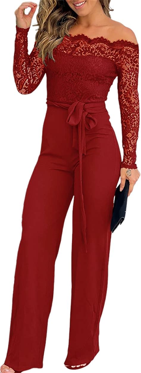 CHICME Womens Dressy Jumpsuits Casual One Piece Outfits Off Shoulder Lace Trim Overalls Straight Leg Pants