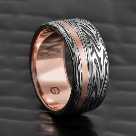 Mens 14K Yellow Gold Inlay Wedding Band Ring | Sunset Damascus Steel | Black | Size 11.5 | Lashbrook