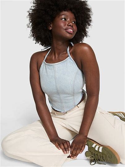 Pink Denim Handkerchief Halter Top, Blue, L - Women's Tops - PINK