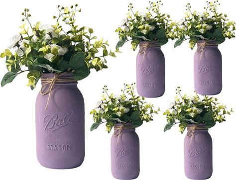 Set Of 5 Painted Mason Jars - Purple Mason Jar With Greenery Ivory Flowers - Butterfly Baby Shower Centerpiece For Girl, 10" First Birthday, Purple Nursery Decor (5 Purple W/Greenery/Ivory)