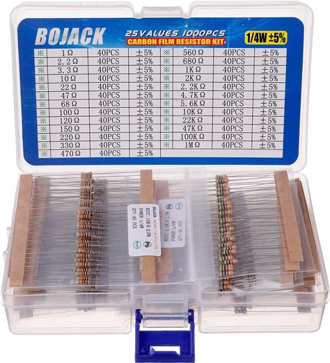BOJACK 1000 Pcs 25 Values Resistor Kit 1 ohm-1m Ohm With 5% 1/4W Carbon Film Resistors Assortment