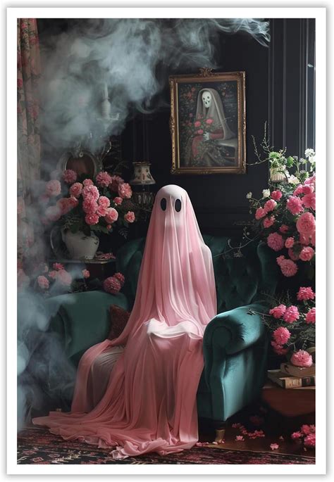 ADRHGCY Retro Pink Ghost Posters Cute Horror Scary Wall Art Ghost Figure Sitting On Weeds Wandering In Abandoned House Prints Painting For Home