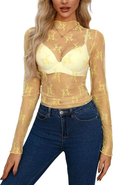 AISEW Womens Mesh Sheer Long Sleeve Crop Tops Mock Neck Sexy See Through Tee Shirts Lace Floral Y2K Layering Top Blouses