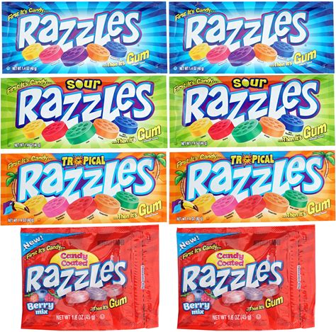 Razzles Candy Gum, 8 Pack Variety, 4 Flavors(2 Packs Of Each, 1.4Oz Bags) Berry, Tropical, Sour & Original Of Candy Then It's Gum