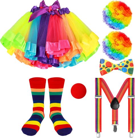 Shinymoon 7 Pcs Girls Clown Costume Set Clown Rainbow Wig Rainbow Tutu Skirt Shoulder Strap Bow Socks Nose For Cosplay