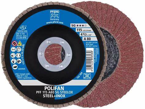 PFERD Flap Disc: 4-1/2" Dia, 7/8" Hole, 80 Grit, Aluminum Oxide, Type 27 - Coated, Medium Grade, Fiber-Backed, 13300 Max RPM | Part 62154