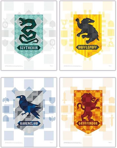 TRENDYPRINT Harry Potter - Hogwarts House Flags - Gryffindor - Slytherin - Ravenclaw - Hufflepuff - Geometric Design - Set Of Four 8" X 10" Wall Art -