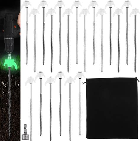 20 Pack 8" Screw In Tent Stakes For Drilling With Hex Heads - Heavy Duty Stainless Steel Tent Pegs/Nails/Spikes, Ground Anchors, Grow In Dark - For